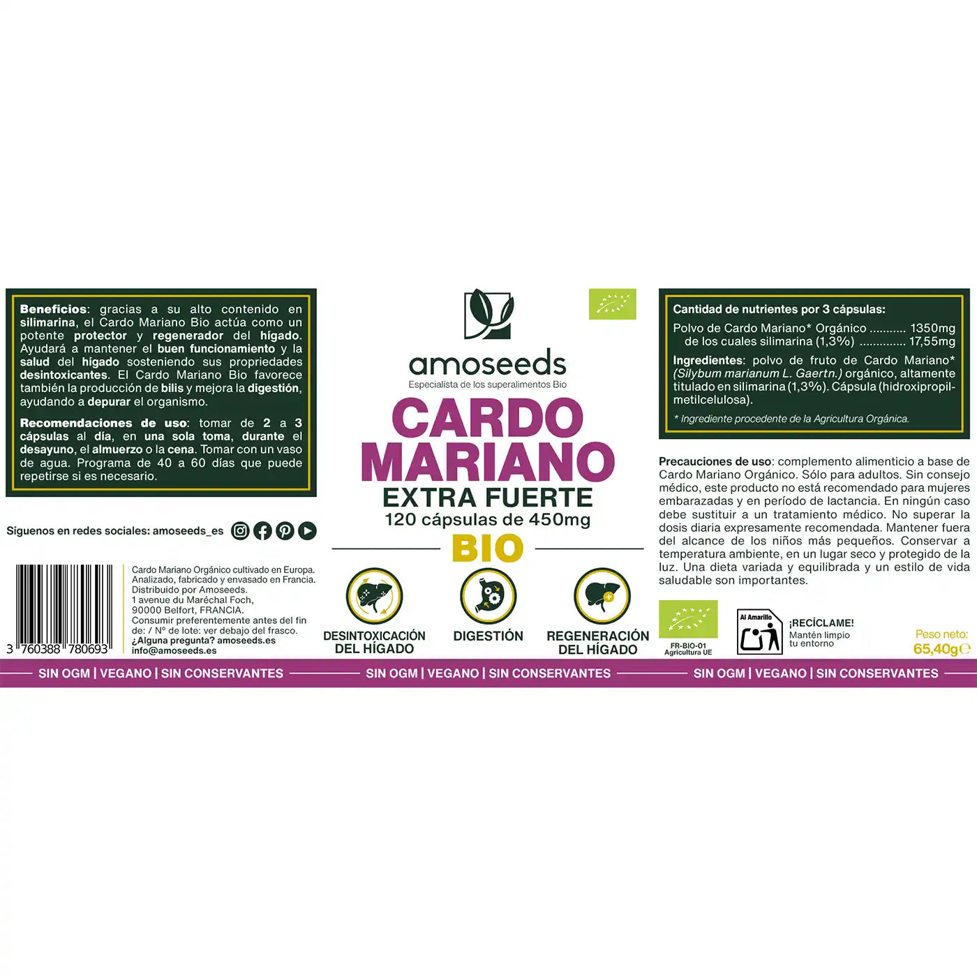 Nuestras cápsulas de Cardo Mariano Bio están formuladas a partir de las semillas de la planta, las partes con mayor concentración de sustancias, para que puedas beneficiarte de todos sus beneficios. Además, la normativa francesa establece que los complementos alimenticios no deben asimilarse a medicamentos. Así, en el caso de nuestro polvo de Cardo Mariano Bio, es indispensable no superar los 280mg de silimarina al día. Por lo tanto, un extracto con un 80% de silimarina correría el riesgo de incumplir la legislación y de provocar una sobredosis contraindicada para la salud de nuestros consumidores.