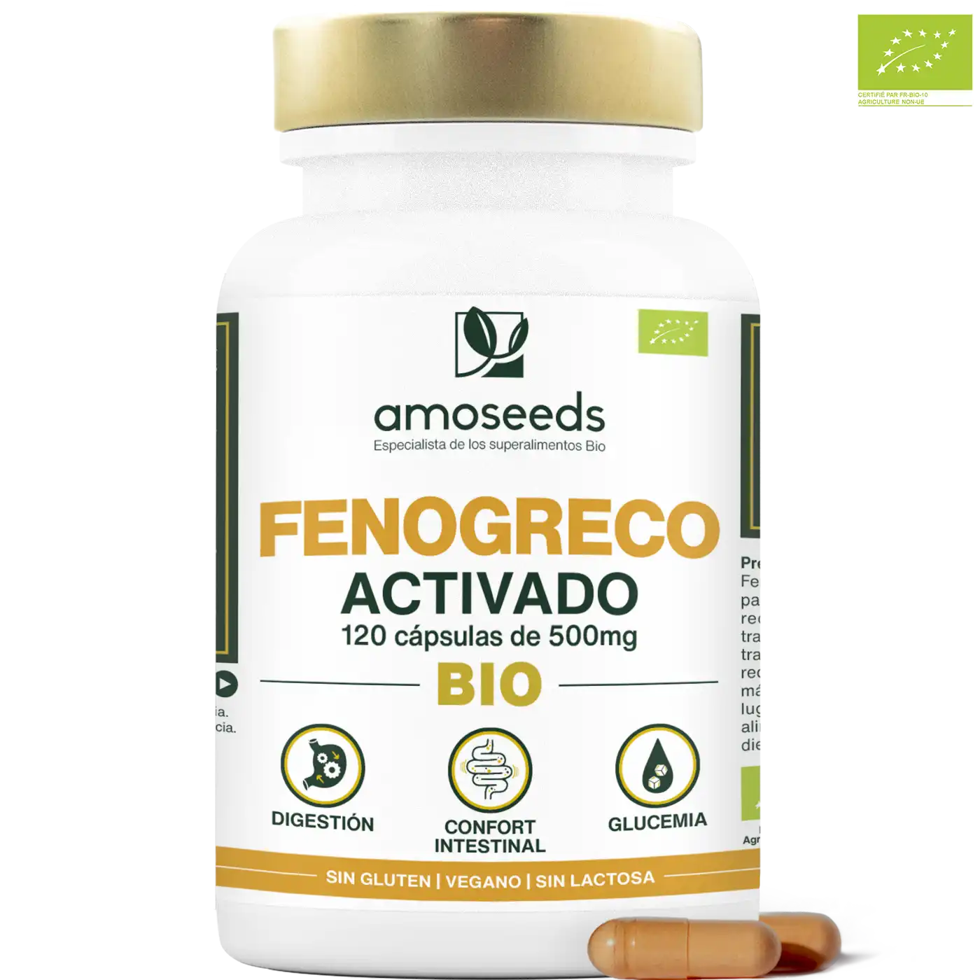 CERTIFICADO ORGÁNICO: frasco reciclable y resellable con 120 cápsulas que contienen 500mg de polvo de semillas de fenogreco activadas orgánicas de calidad superior. Producto 100% puro, vegano, sin solventes, sin óxido de etileno, sin aditivos, sin conservantes, sin OMG, sin pesticidas, sin colorantes artificiales y sin gluten. Semillas de fenogreco cultivadas en la India. Producto analizado, fabricado y envasado en Francia.