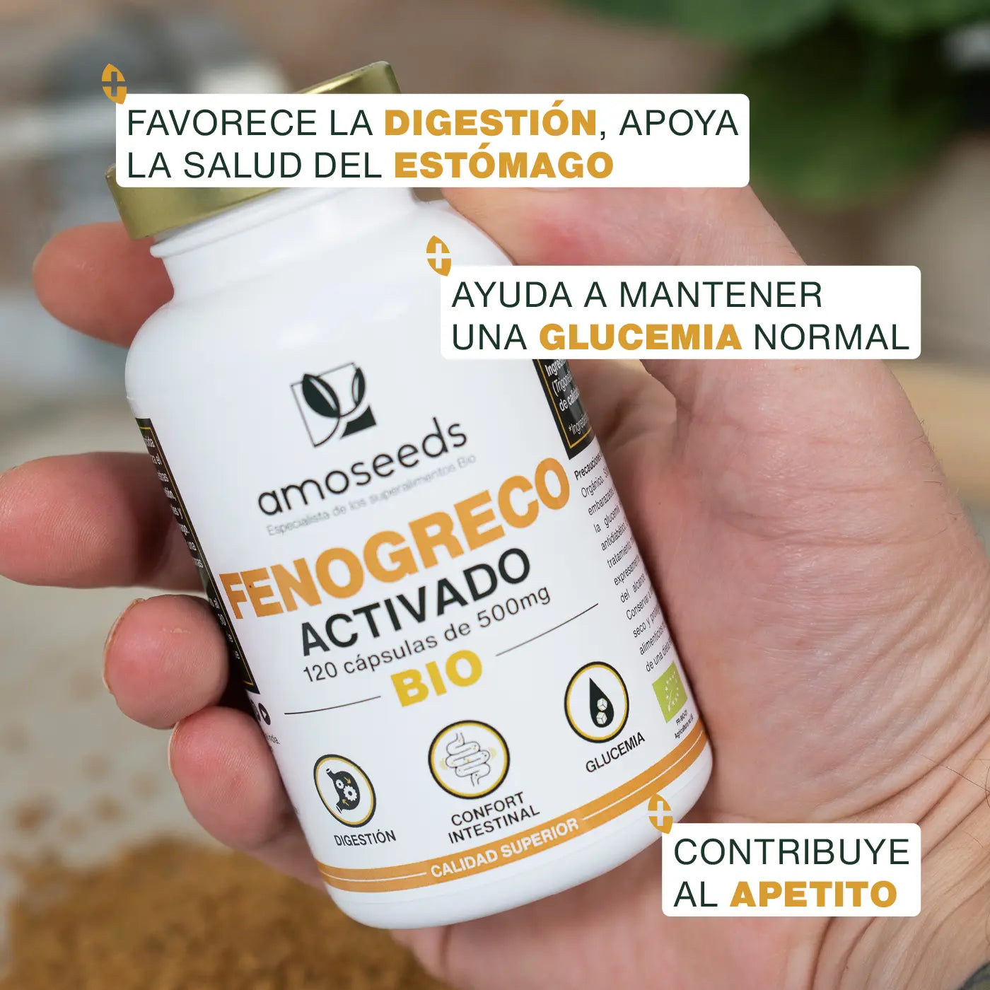 ESTIMULACIÓN DEL APETITO: más allá de sus beneficios digestivos, nuestras cápsulas de Fenogreco Bio también son reconocidas por sus propiedades aperitivas. El ligero amargor natural del fenogreco ayuda a estimular el apetito, especialmente en caso de pérdida temporal del hambre causada por una digestión pesada o un estado de fatiga general.